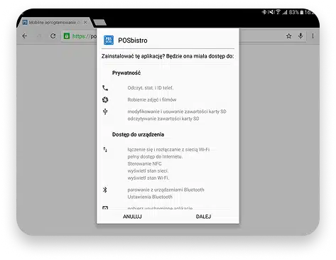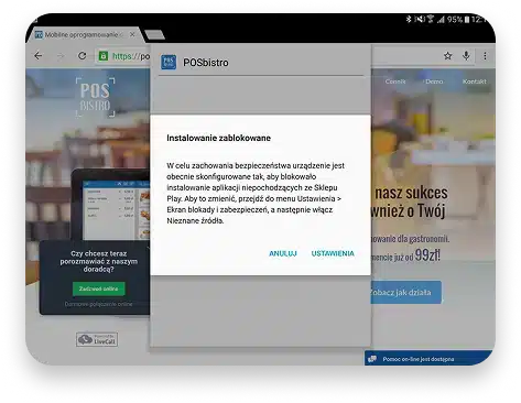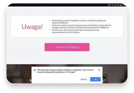 Klikając w przycisk poniżej „Pobierz POSbistro”, rozpocznie się pobieranie aktualizacji. W przypadku gdy pojawi się komunikat o możliwych szkodach na urządzeniu, naciśnij “OK” Uwaga: Przed aktualizacją systemu sprawdź w zakładce „Informacje” czy wszystkie dane zostały wysłane na serwer. Przygotuj również aktualny login oraz hasło, aby zalogować się do nowej wersji.