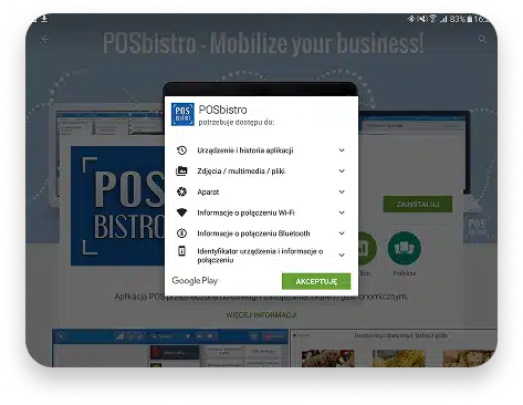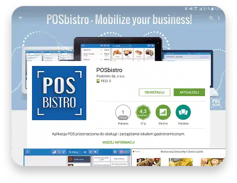 Klikając w przycisk poniżej „Pobierz POSbistro z Google Play”, zostaniesz przeniesiony do strony POSbistro w Sklepie Google Play. Naciśnij przycisk “AKTUALIZUJ”.